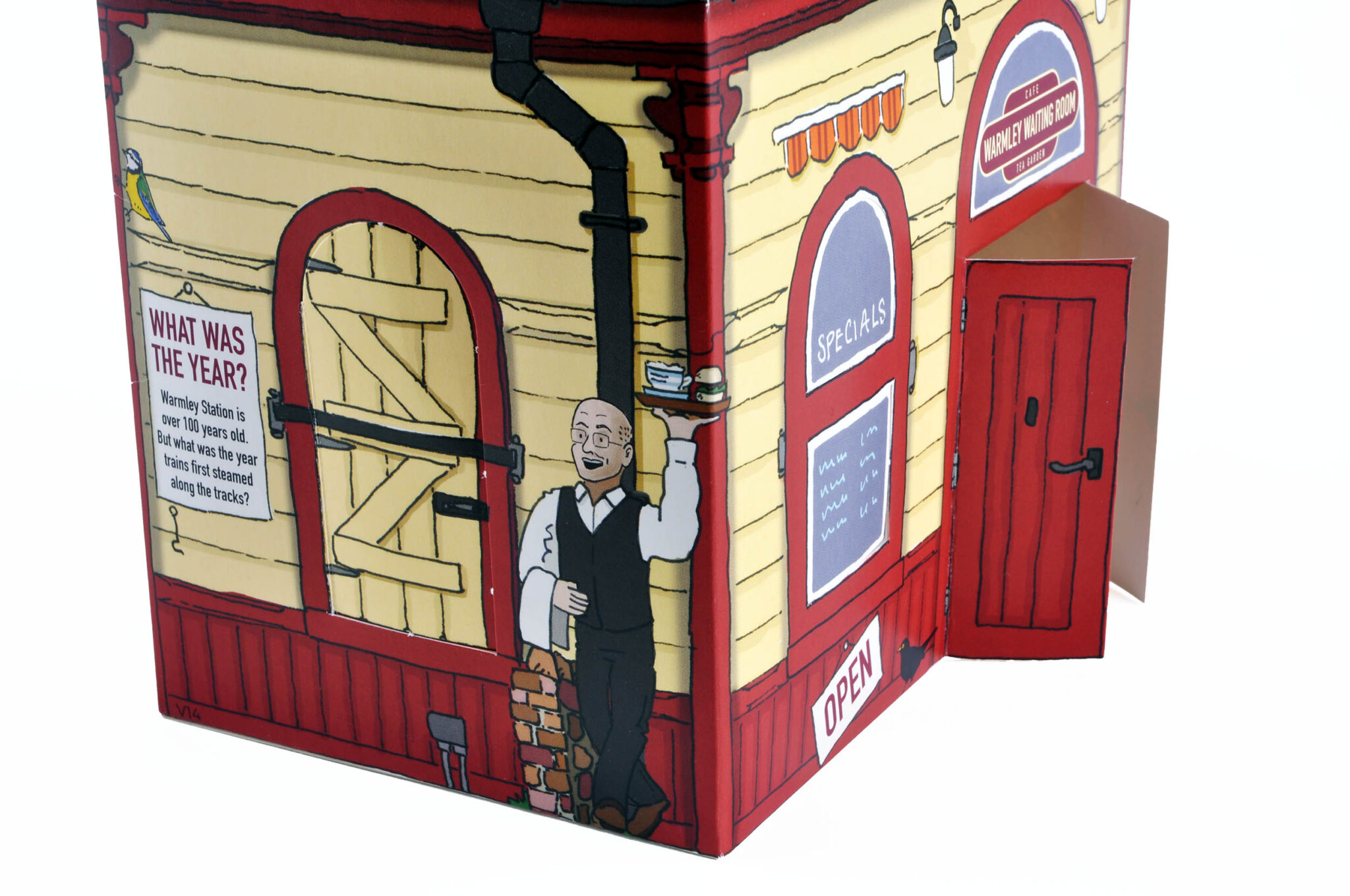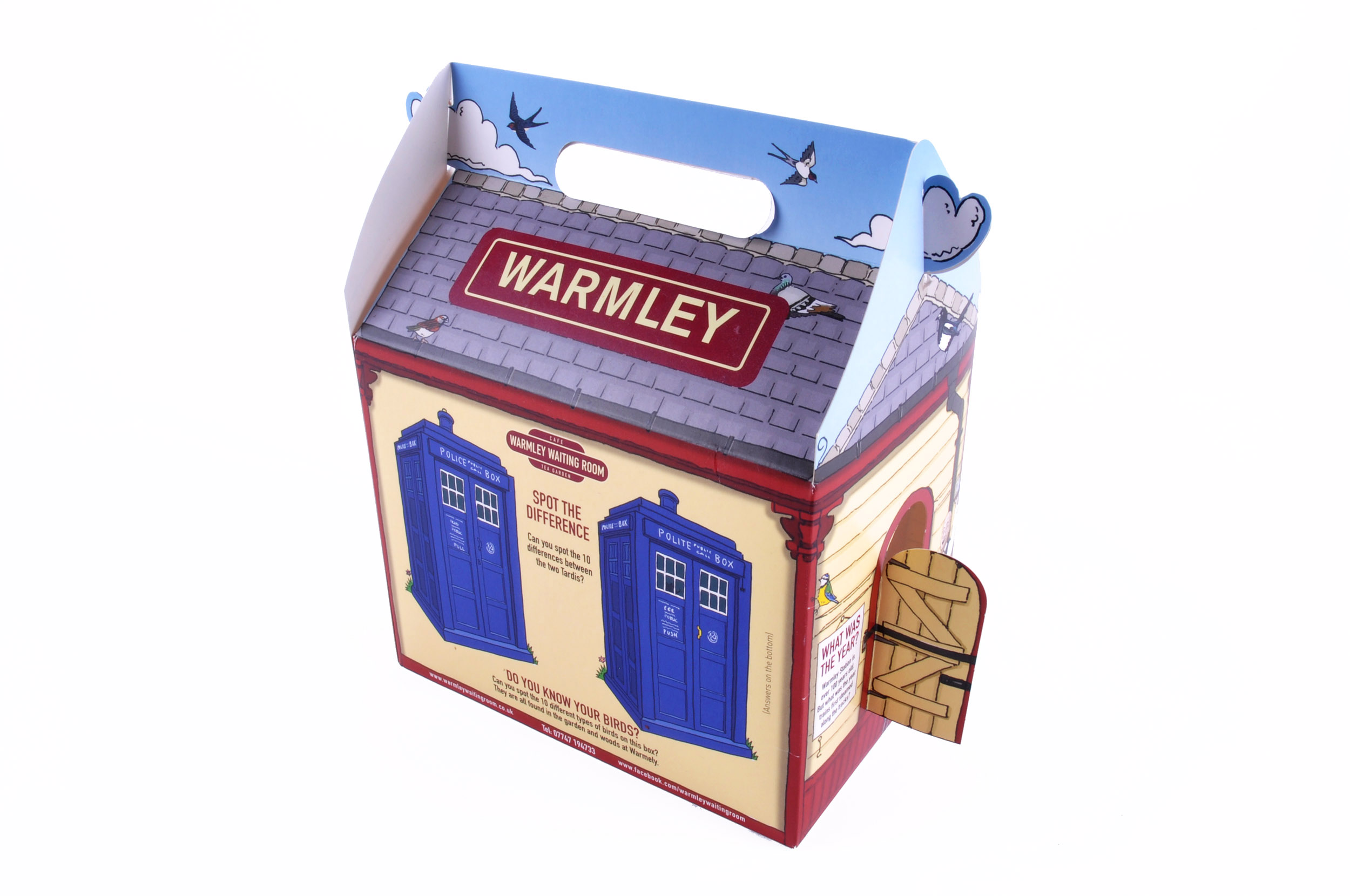 We designed the Warmley Waiting Room lunchbox for our relatives who own and run the delightful café located on the Bristol-Bath cycle path in what used to be a train lounge. The lunchbox is a 3D paper replica of the café itself, and it is very popular with children. On the back of the lunchbox, there is a spot-the-difference puzzle based on the café’s legendary TARDIS bathroom. Additionally, there are ten species of birds to find dotted around the lunchbox.